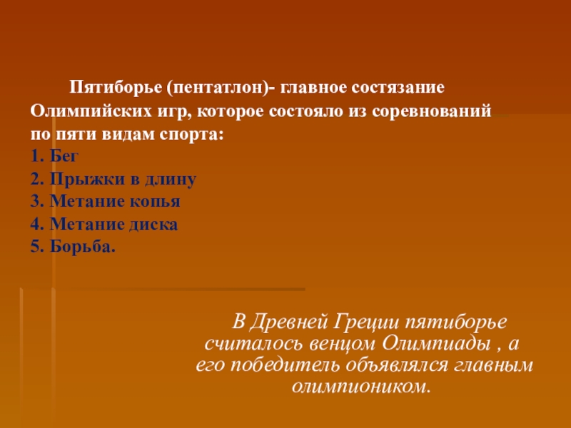 В Древней Греции пятиборье считалось венцом Олимпиады , а его победитель объявлялся главным олимпиоником.