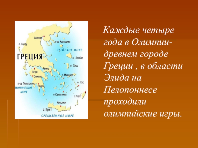 Слайд 4 Каждые четыре года в Олимпии- древнем городе Греции ,