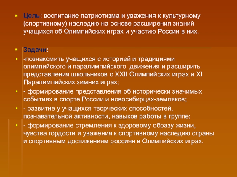 Слайд 2Цель: воспитание патриотизма и уважения к культурному (спортивному) наследию на основе