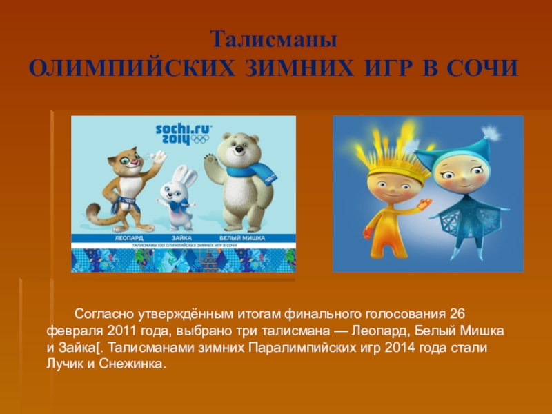 26 февраля 2011 года, выбрано три талисмана — Леопард, Белый Мишка и Зайка[. Талисманами зимних Паралимпийских игр 2014 года стали Лучик и Снежинка.