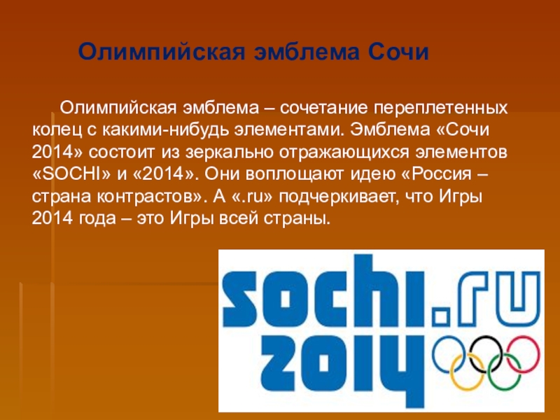 Слайд 18Олимпийская эмблема – сочетание переплетенных колец с какими-нибудь элементами. Эмблема «Сочи