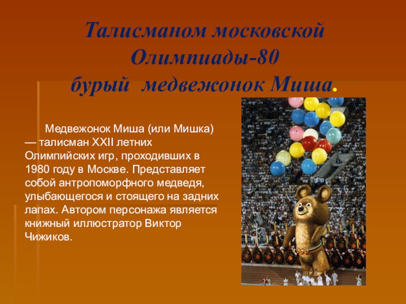 XXII летних Олимпийских игр, проходивших в 1980 году в Москве. Представляет собой антропоморфного медведя, улыбающегося и стоящего на задних лапах. Автором персонажа является книжный иллюстратор Виктор Чижиков.