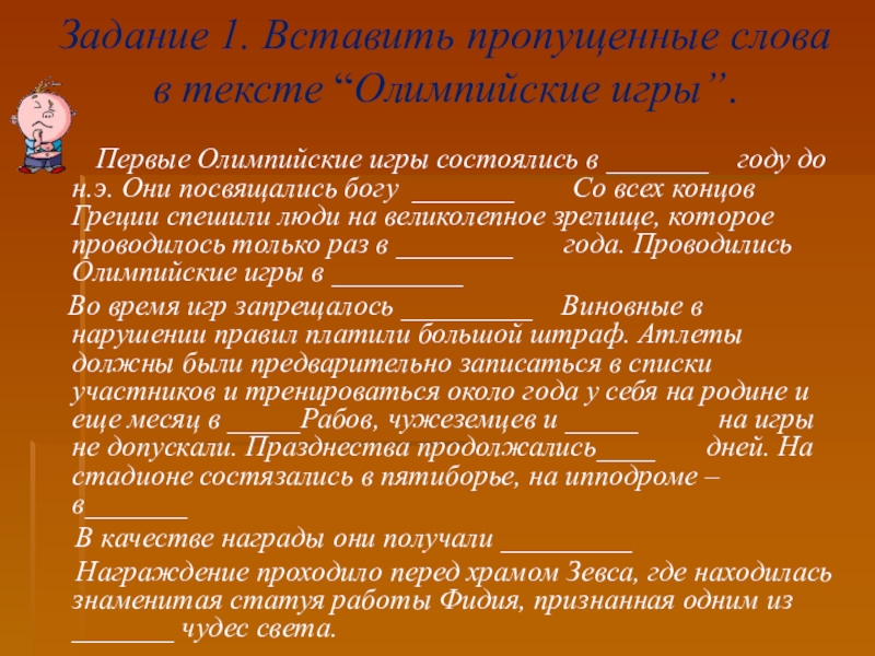 Слайд 27Задание 1. Вставить пропущенные слова в тексте “Олимпийские игры”.