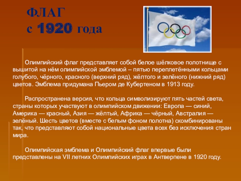 Олимпийская эмблема и Олимпийский флаг впервые были представлены на VII летних Олимпийских играх в Антверпене в 1920 году.