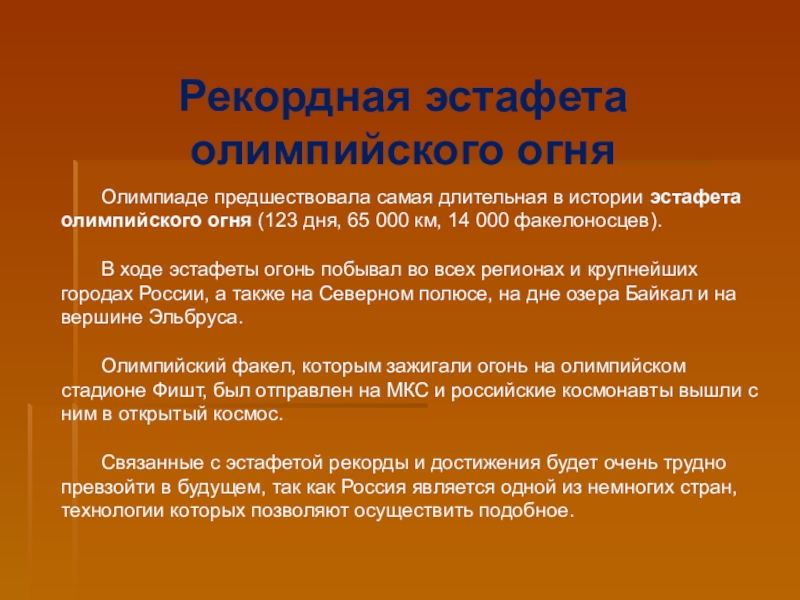 Слайд 24Олимпиаде предшествовала самая длительная в истории эстафета олимпийского огня (123 дня, 65 000 км,