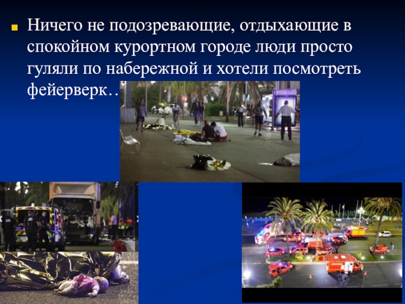 Слайд 30Ничего не подозревающие, отдыхающие в спокойном курортном городе люди просто гуляли