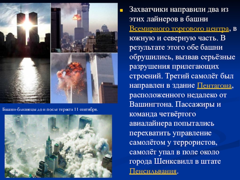 в южную и северную часть. В результате этого обе башни обрушились, вызвав серьёзные разрушения прилегающих строений. Третий самолёт был направлен в здание Пентагона, расположенного недалеко от Вашингтона. Пассажиры и команда четвёртого авиалайнера попытались перехватить управление самолётом у террористов, самолёт упал в поле около города Шенксвилл в штате Пенсильвания.