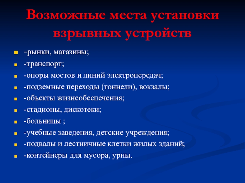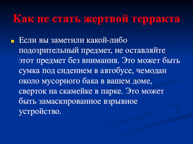 оставляйте этот предмет без внимания. Это может быть сумка под сидением в автобусе, чемодан около мусорного бака в вашем доме, сверток на скамейке в парке. Это может быть замаскированное взрывное устройство.