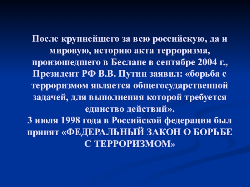 произошедшего в Беслане в сентябре 2004 г., Президент РФ В.В. Путин заявил: «борьба с терроризмом является общегосударственной задачей, для выполнения которой требуется единство действий».