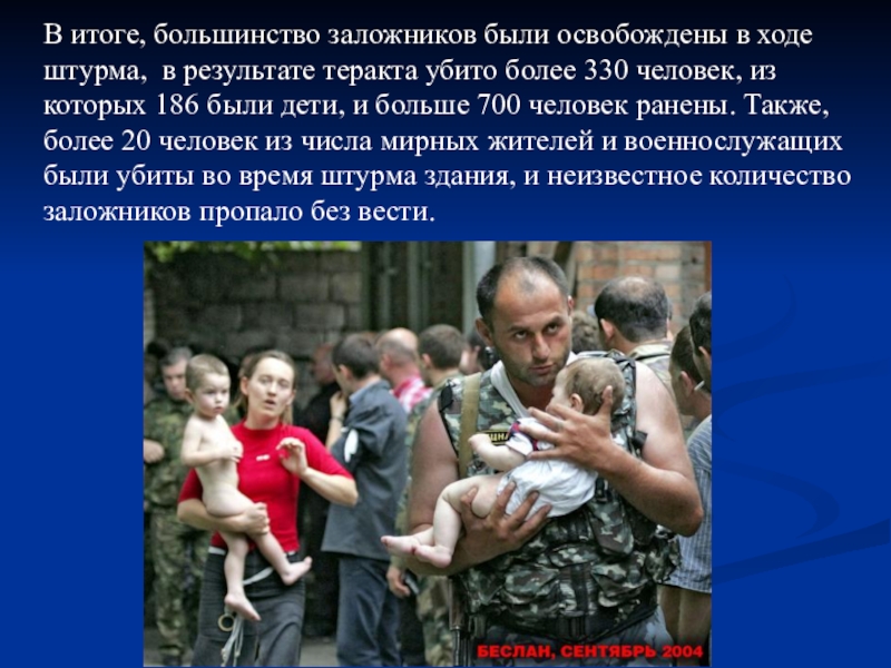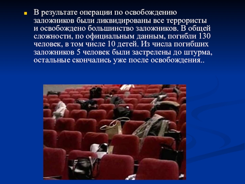 Слайд 17В итоге, большинство заложников были освобождены в ходе штурма, в результате