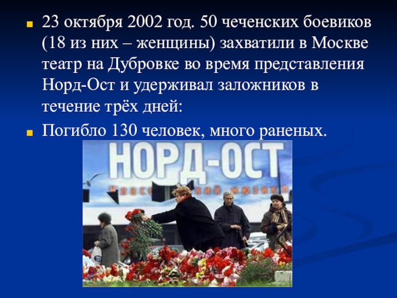 Слайд 923 октября 2002 год. 50 чеченских боевиков (18 из них –