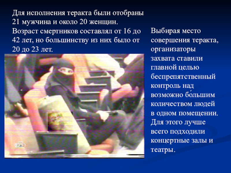 Слайд 11Для исполнения теракта были отобраны 21 мужчина и около 20 женщин.