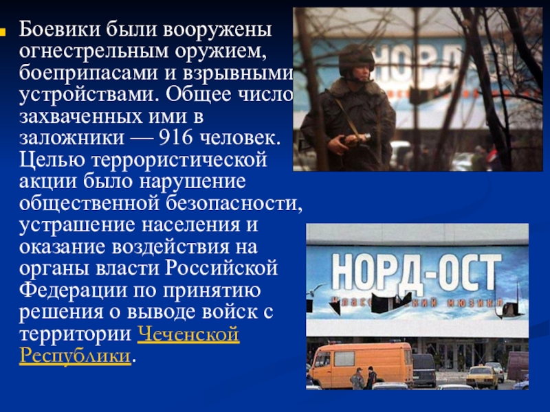 захваченных ими в заложники — 916 человек. Целью террористической акции было нарушение общественной безопасности, устрашение населения и оказание воздействия на органы власти Российской Федерации по принятию решения о выводе войск с территории Чеченской Республики.