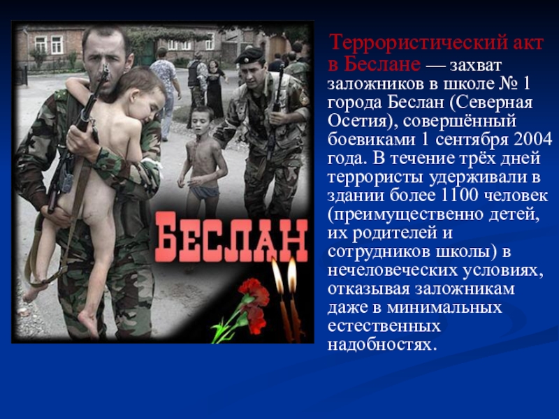 № 1 города Беслан (Северная Осетия), совершённый боевиками 1 сентября 2004 года. В течение трёх дней террористы удерживали в здании более 1100 человек (преимущественно детей, их родителей и сотрудников школы) в нечеловеческих условиях, отказывая заложникам даже в минимальных естественных надобностях.