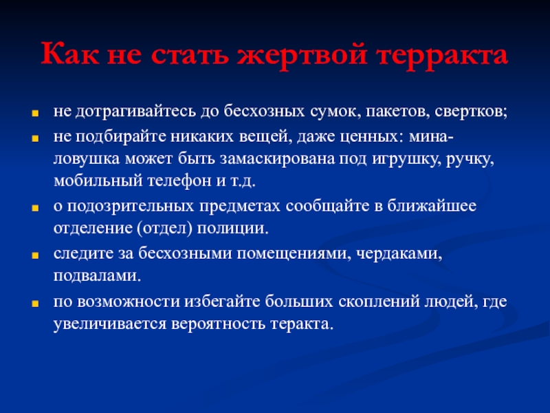 по возможности избегайте больших скоплений людей, где увеличивается вероятность теракта.