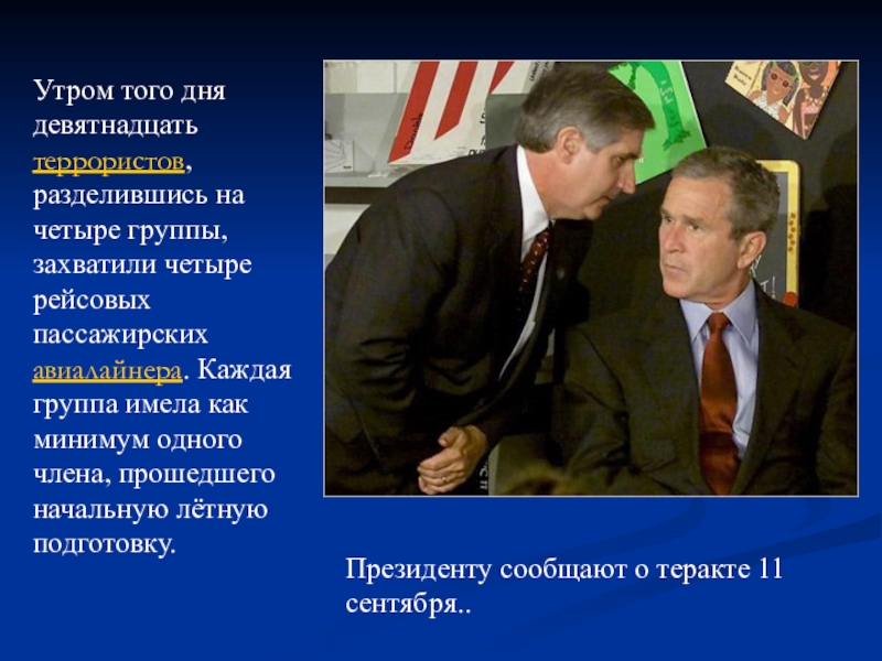 Слайд 27Президенту сообщают о теракте 11 сентября..
