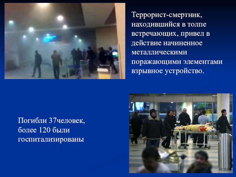 Слайд 22Террорист-смертник, находившийся в толпе встречающих, привел в действие начиненное металлическими поражающими