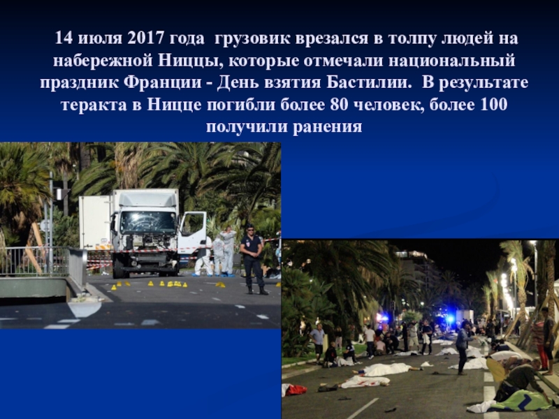 Слайд 29 14 июля 2017 года грузовик врезался в толпу людей на