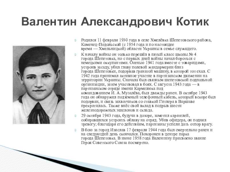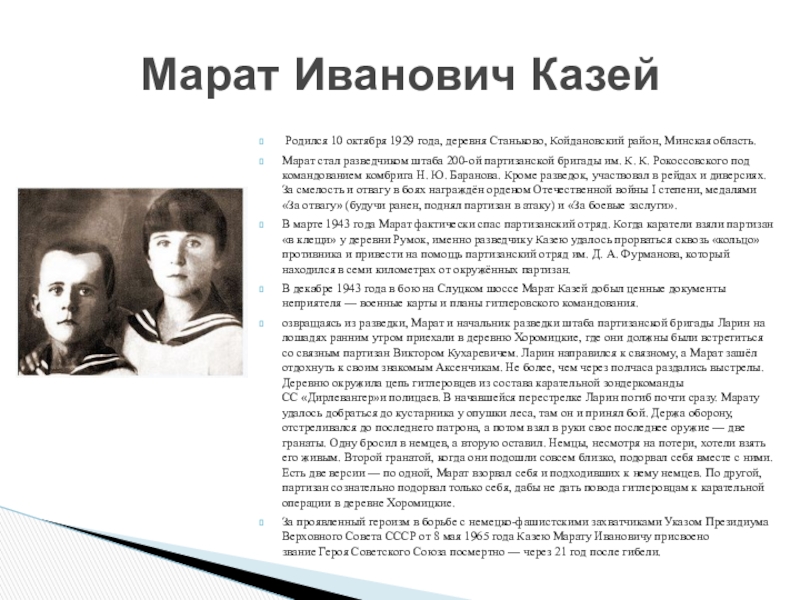 Впоследствии был внесён в список пионеров-героев, хотя уже к началу войны ему исполнилось 15 лет.