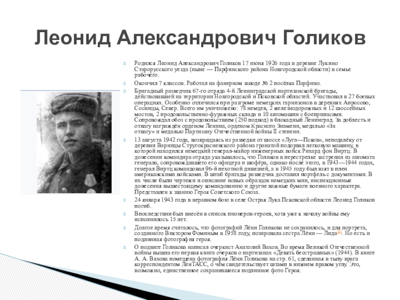 Долгое время считалось, что фотографий Лёни Голикова не сохранилось, и для портрета, созданного Виктором Фоминым в 1958 году, позировала сестра Лёни — Лида[5]. Но есть и подлинная фотография героя.