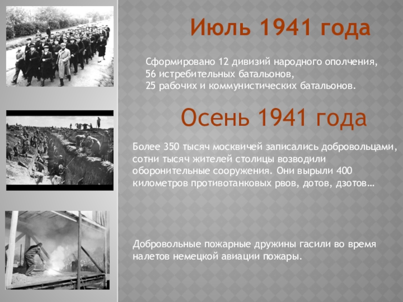 Более 350 тысяч москвичей записались добровольцами, сотни тысяч жителей столицы возводили оборонительные сооружения. Они вырыли 400 километров противотанковых рвов, дотов, дзотов…