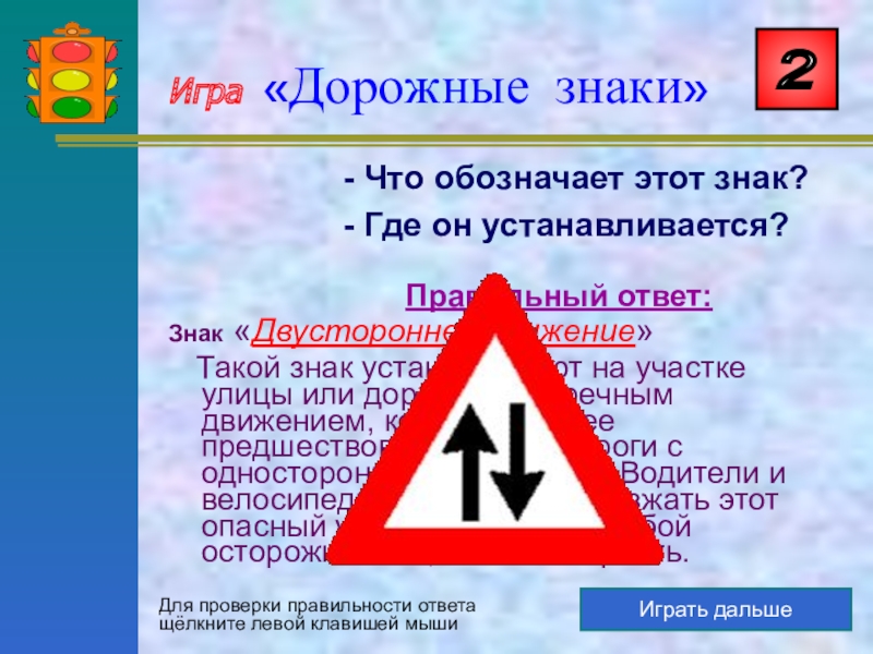 Такой знак устанавливают на участке улицы или дороги со встречным движением, которому ранее предшествовал участок дороги с односторонним движением. Водители и велосипедисты должны проезжать этот опасный участок дороги с особой осторожностью, снизив скорость.