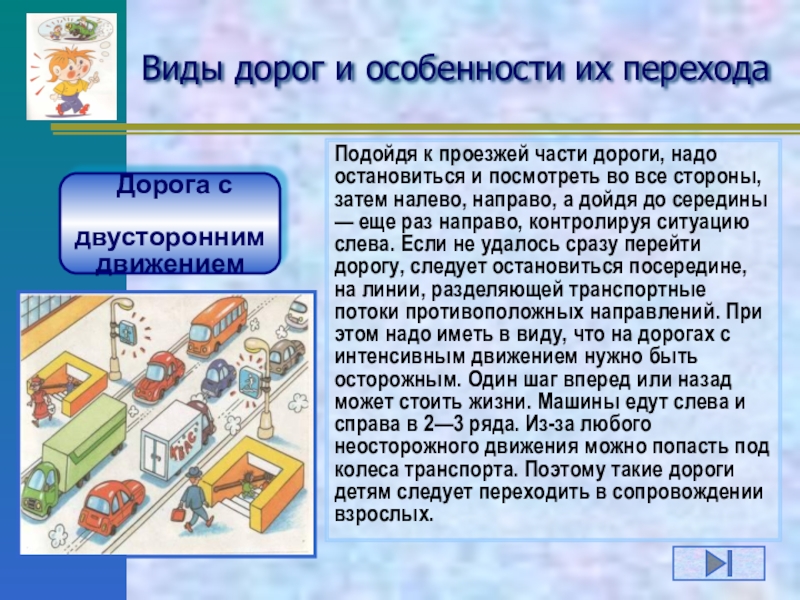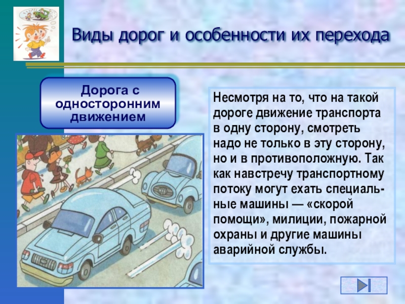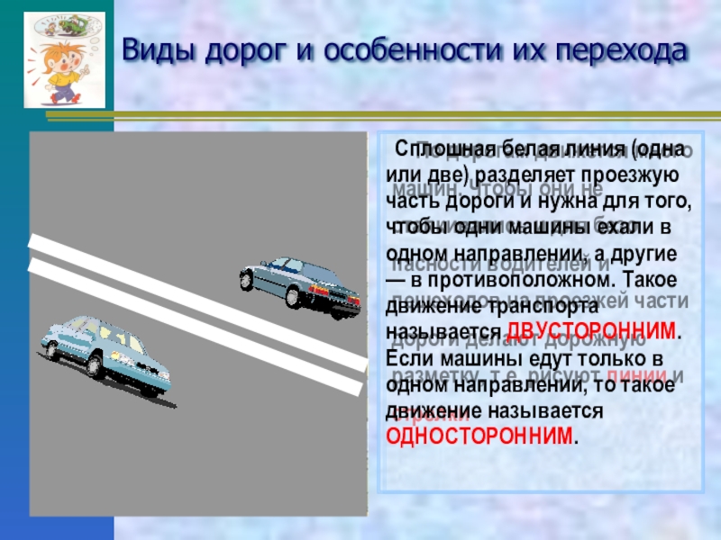 Сплошная белая линия (одна или две) разделяет проезжую часть дороги и нужна для того, чтобы одни машины ехали в одном направлении, а другие — в противоположном. Такое движение транспорта называется ДВУСТОРОННИМ. Если машины едут только в одном направлении, то такое движение называется ОДНОСТОРОННИМ.
