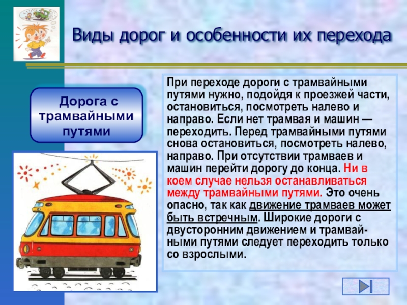 В некоторых городах дорогу часто пересекают трамвайные линии. Они опасны для водителей и пешеходов. Пешеходы, велосипедисты и водители автомашин должны полностью убедиться в том, что нет приближающегося трамвая, и только после этого можно пересекать трамвайные пути.