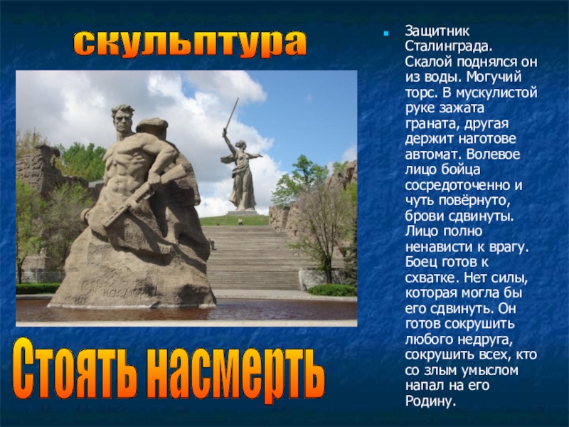 Скульптура «Родина-мать зовёт!» — композиционный центр памятника-ансамбля «Героям Сталинградской битвы» на Мамаевом кургане в Волгограде. 1959—1967 года