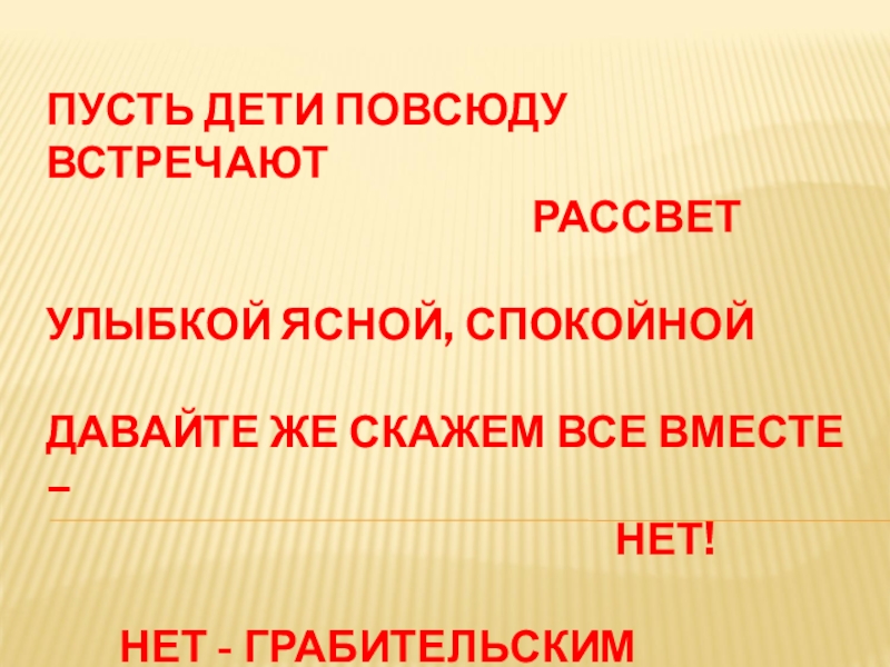 РАССВЕТ УЛЫБКОЙ ЯСНОЙ, СПОКОЙНОЙ ДАВАЙТЕ ЖЕ СКАЖЕМ ВСЕ ВМЕСТЕ – НЕТ! НЕТ - ГРАБИТЕЛЬСКИМ ВОЙНАМ.