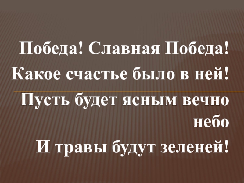 Победа! Славная Победа!Какое счастье было в ней!  Пусть будет ясным вечно небоИ травы будут зеленей!