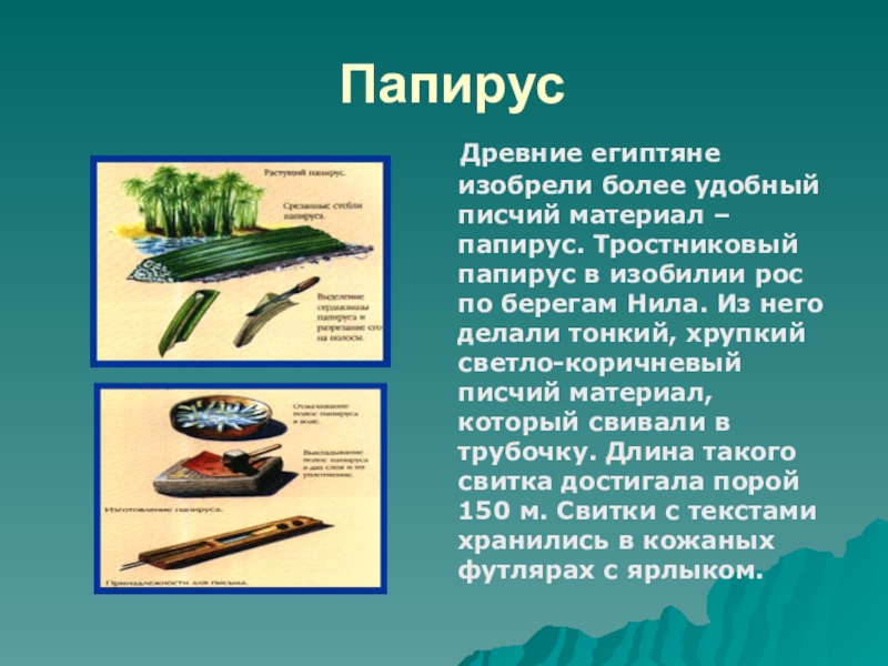 Тростниковый папирус в изобилии рос по берегам Нила. Из него делали тонкий, хрупкий светло-коричневый писчий материал, который свивали в трубочку. Длина такого свитка достигала порой 150 м. Свитки с текстами хранились в кожаных футлярах с ярлыком.