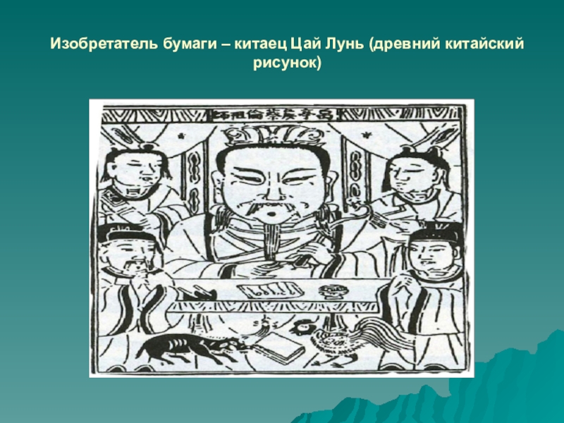 Слайд 18Изобретатель бумаги – китаец Цай Лунь (древний китайский рисунок)
