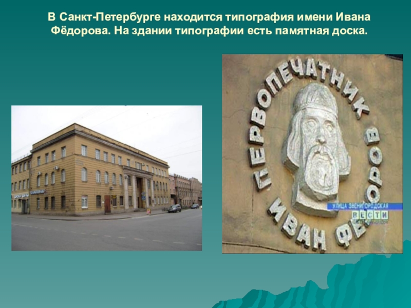 Слайд 41В Санкт-Петербурге находится типография имени Ивана Фёдорова. На здании типографии есть