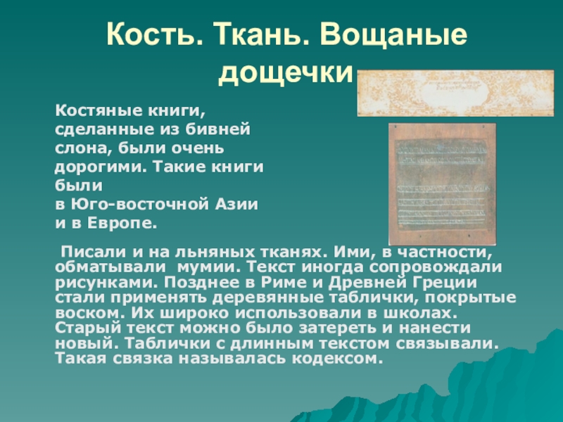 Писали и на льняных тканях. Ими, в частности, обматывали мумии. Текст иногда сопровождали рисунками. Позднее в Риме и Древней Греции стали применять деревянные таблички, покрытые воском. Их широко использовали в школах. Старый текст можно было затереть и нанести новый. Таблички с длинным текстом связывали. Такая связка называлась кодексом.