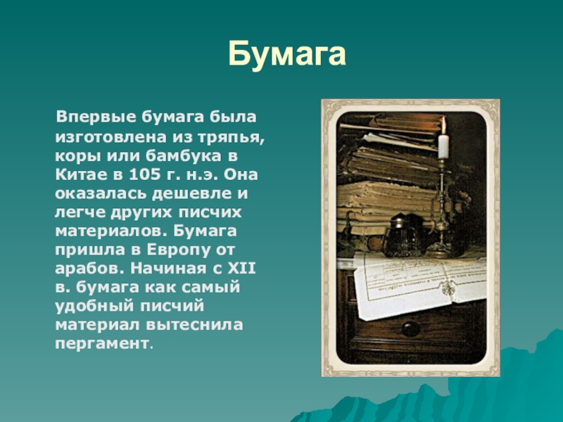 в Китае в 105 г. н.э. Она оказалась дешевле и легче других писчих материалов. Бумага пришла в Европу от арабов. Начиная с ХII в. бумага как самый удобный писчий материал вытеснила пергамент.