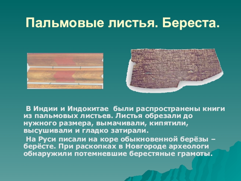 Слайд 13Пальмовые листья. Береста.