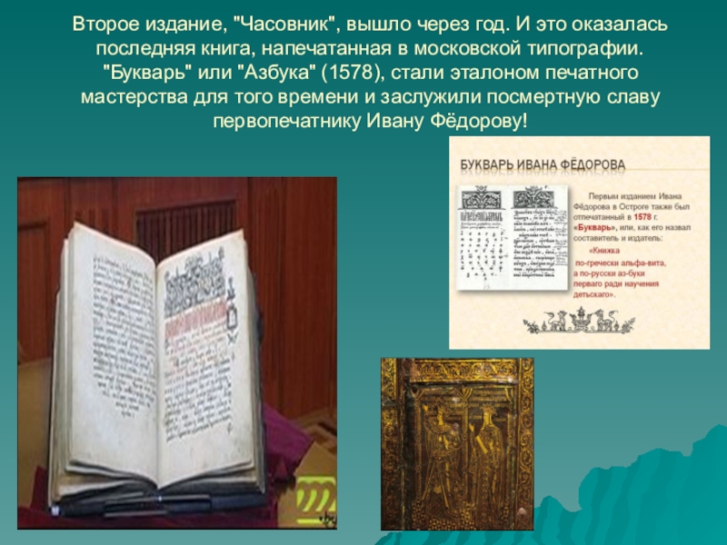 напечатанная в московской типографии. "Букварь" или "Азбука" (1578), стали эталоном печатного мастерства для того времени и заслужили посмертную славу первопечатнику Ивану Фёдорову!