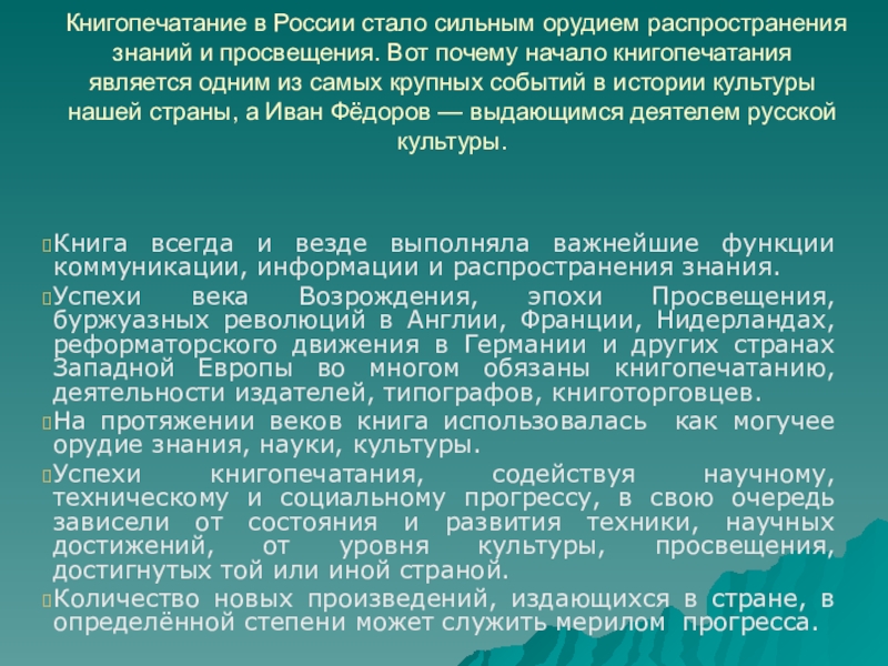почему начало книгопечатания является одним из самых крупных событий в истории культуры нашей страны, а Иван Фёдоров — выдающимся деятелем русской культуры.