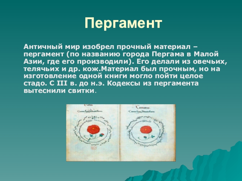 города Пергама в Малой Азии, где его производили). Его делали из овечьих, телячьих и др. кож.Материал был прочным, но на изготовление одной книги могло пойти целое стадо. С III в. до н.э. Кодексы из пергамента вытеснили свитки.