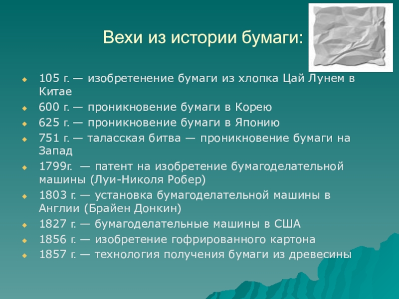 Слайд 17Вехи из истории бумаги: