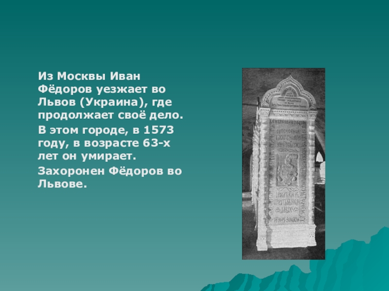 Из Москвы Иван Фёдоров уезжает во Львов (Украина), где