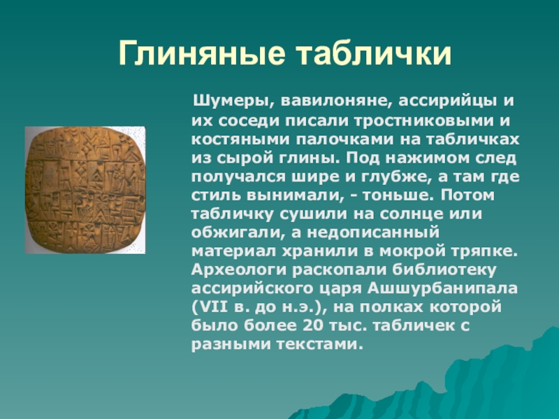 и костяными палочками на табличках из сырой глины. Под нажимом след получался шире и глубже, а там где стиль вынимали, - тоньше. Потом табличку сушили на солнце или обжигали, а недописанный материал хранили в мокрой тряпке. Археологи раскопали библиотеку ассирийского царя Ашшурбанипала (VII в. до н.э.), на полках которой было более 20 тыс. табличек с разными текстами.