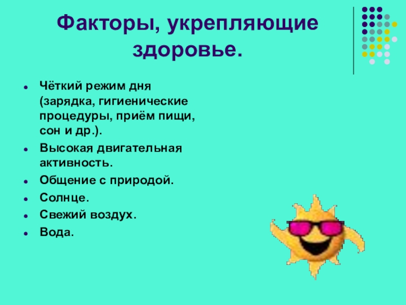 Факторы, укрепляющие здоровье.Чёткий режим дня (зарядка, гигиенические процедуры, приём пищи, сон и др.).Высокая двигательная активность.Общение с природой.Солнце.Свежий