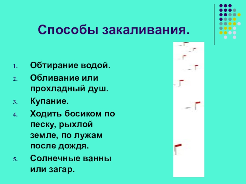 Способы закаливания.Обтирание водой.Обливание или прохладный душ.Купание.Ходить босиком по песку, рыхлой земле, по лужам после дождя.Солнечные ванны или