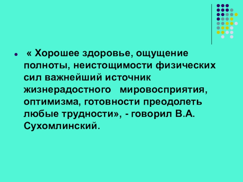 « Хорошее здоровье, ощущение полноты, неистощимости физических сил важнейший источник жизнерадостного мировосприятия, оптимизма, готовности преодолеть любые трудности», - говорил В.А.Сухомлинский.