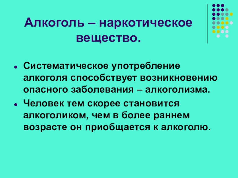 Алкоголь – наркотическое вещество.Систематическое употребление алкоголя способствует возникновению опасного заболевания – алкоголизма.Человек тем скорее становится алкоголиком, чем