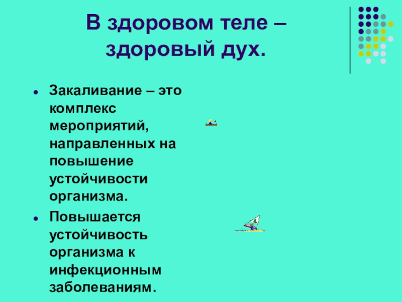В здоровом теле –  здоровый дух.Закаливание – это комплекс мероприятий, направленных на повышение устойчивости организма. Повышается