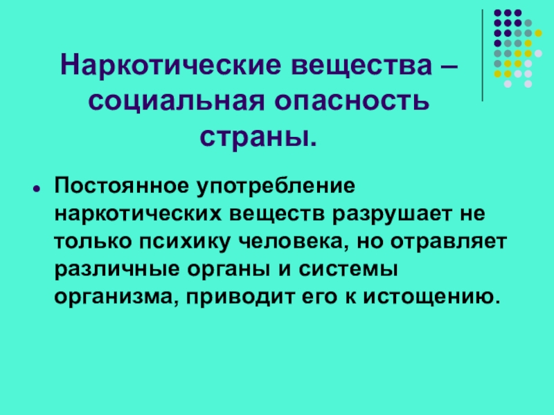 Наркотические вещества – социальная опасность страны.Постоянное употребление наркотических веществ разрушает не только психику человека, но отравляет различные
