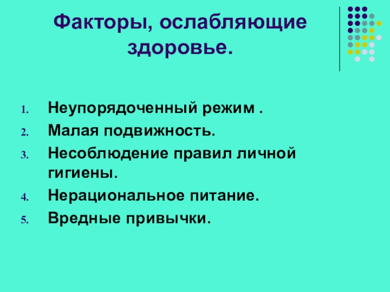 Факторы, ослабляющие здоровье.Неупорядоченный режим .Малая подвижность.Несоблюдение правил личной гигиены.Нерациональное питание.Вредные привычки.